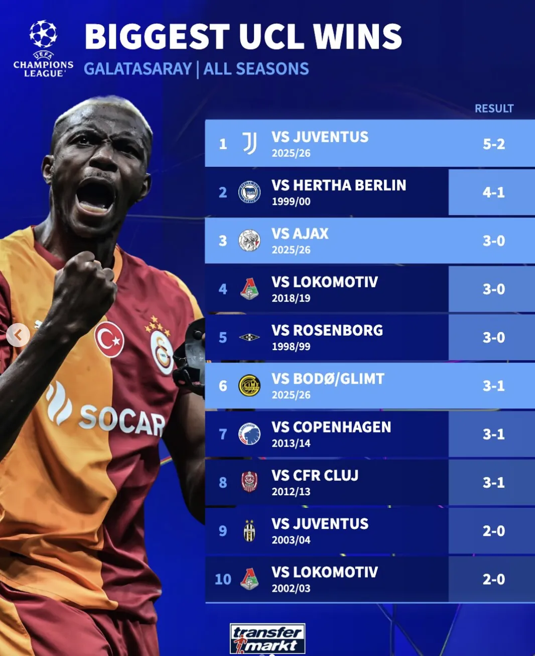 今天凌晨5-2战胜尤文图斯的比赛是球队队史最大获胜比分。本赛季3-0战胜阿贾克斯和3-1战胜博德闪耀的比赛能排在榜单第3和第6位。