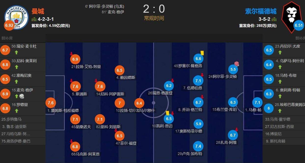 足球直播,欧洲杯直播,体育直播,球客直播,雷速体育,篮球直播,风驰直播,NBA直播,英超直播,足球比分,足球赛事,意甲,欧冠,世界杯,世界杯直播,村超,贵州村超,波胆,角球,串球,大小球2026年2月14日,伊蒂哈德球场的夜晚,一场本该是“大人打小孩”的足总杯比赛,却演变成了英超豪门曼城的尴尬秀。 面对来自英乙、全队首发身价仅288万欧元的索尔福德城,曼城派出了价值4.59亿欧元的轮换阵容,结果这群身价是对手159倍的“天之骄子”,在场上踢得像个无头苍蝇,完全被英乙球队带着节奏走。 直到核心罗德里替补登场,场面才勉强稳住。 赛后,主帅瓜迪奥拉的脸黑得像锅底,他丢下一句:“唯一的好消息就是我们晋级了。 ”一场2-0的胜利,硬是踢出了输球的味道。