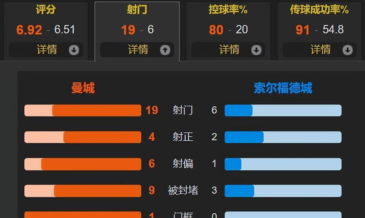 这场比赛的数据对比,冰冷得刺眼。 曼城控球率高达80%,全场轰出19脚射门,但只有4次打在门框范围内。 而总身价不到300万欧元的索尔福德城,用仅有的6次射门,同样换来了4次射正。 159倍的身价差距,在射正这项关键效率指标上,竟然只是4比2的微弱领先。 这已经不是“杀鸡用牛刀”了,这是“用航空母舰去打渔船,结果差点被渔船的跳帮战给掀了”。