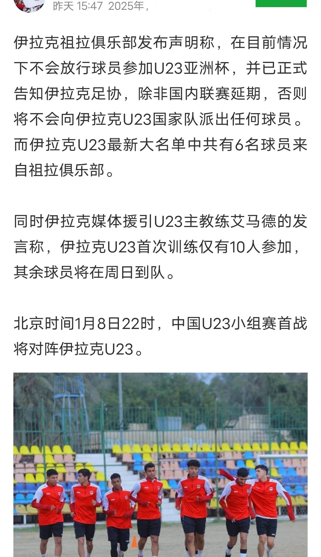 现在U22国足对手伊拉克U22国足传来最新消息,据体育媒体人透露,伊拉克国内祖拉俱乐部拒放6名球员,前往伊拉克U22国足报到。祖拉队表示:U23亚洲杯赛事并不在国际比赛日进行,球队有权拒绝国家队征召,除非伊拉克足协能把祖拉队几场比赛延期举行,否则球队将拒放球员参加U23亚洲杯比赛。而伊拉克足协表示,联赛赛程已经制定突然延期对其它球队不公平,因此这6名祖拉队球员大概率将无缘参加U23亚洲杯比赛。